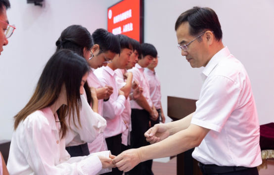 在新辅导员入职仪式环节,涂立桥赠送新辅导员校徽、入职礼包,希望新辅导员尽快适应新的角色,珍惜岗位、不负重托,以更加饱满的热情、更加昂扬的斗志、更加务实的作风投入学生工作,助力学生成长成才。