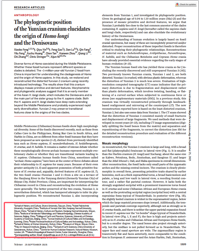 本网消息 9月26日,我校东楚学者特聘教授冯小波研究团队,在《Science》(《科学》)杂志发表文章“The phylogenetic position of the Yunxian cranium elucidates the origin of Homo longiand the Denisovans”(《郧县人颅骨的系统发育位置阐明龙人与丹尼索瓦人的起源》)。