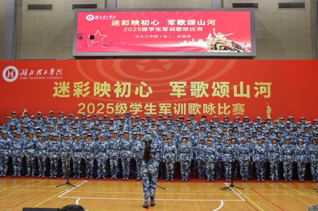 本网消息 11月6日下午,以“迷彩映初心,军歌颂山河”为主题的2025级新生军训歌咏比赛在我校东门体育馆举行。承训部队指导员姚攀、校党委书记张方胜、校党委副书记涂立桥出席活动,各职能部门负责人、各教学院党总支副书记、辅导员、在校生“教官团队”以及2025级全体新生共同参与。活动由校学工部、武装部主办,校“美工坊”辅导员工作室承办。