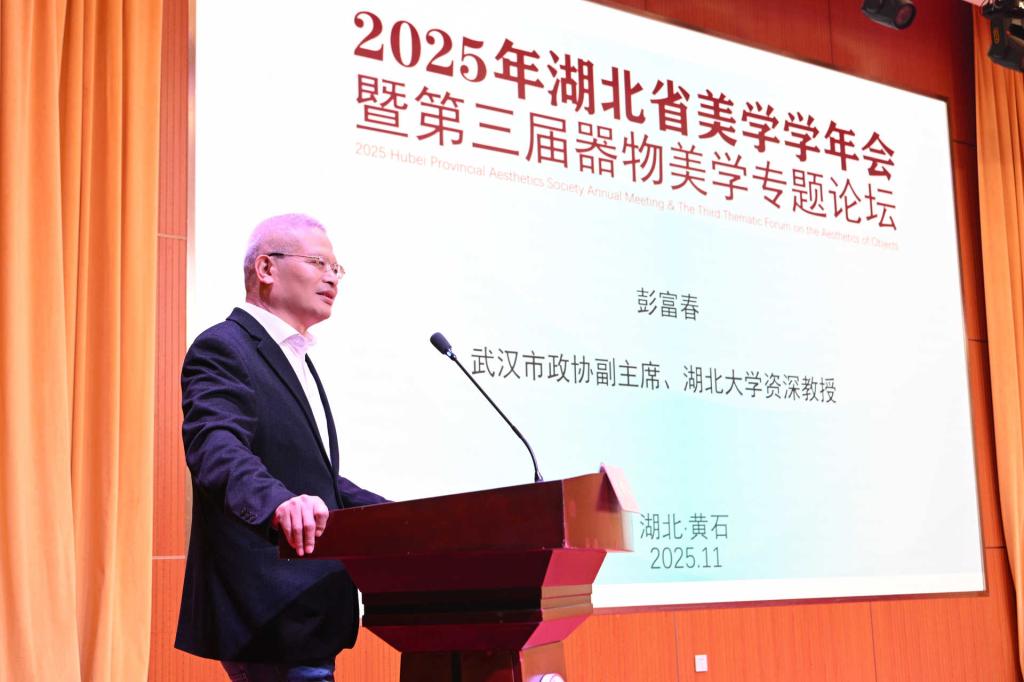 湖北理工学院党委副书记、校长胡国珍致欢迎词。他代表湖北理工全体师生,向远道而来的专家学者致以热烈的欢迎和由衷的感谢。他指出,“艺术学理论”作为省级重点(培育)学科,与学校深厚的工业基因相融合,在工业设计美学、矿冶器物研究等领域形成了独特优势;长江中游矿冶文化与经济社会发展研究中心,更成为挖掘矿冶器物美学价值、传承工业文明的重要研究载体,为学术创新与成果转化提供了有力支撑。本次论坛以“器物美学”为专题,为理工与人文的跨界对话搭建了宝贵平台。本次年会的举办,必将推动各位专家学者围绕数智时代美学转型、器物美学理论深化等议题、凝聚共识;助力我校深化学科交叉、挖掘本土文化价值,为文化创新与设计实践贡献理工力量。