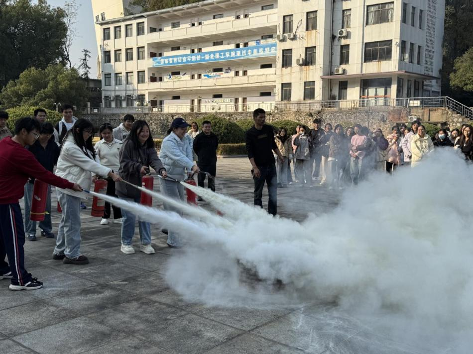疏散集结完毕后,在集合点现场,张建发老师为师生们带来了一堂生动的“消防安全课”,详细讲解了干粉灭火器的构造、原理及操作要点,并进行了现场示范。在专业人员的指导下,学生代表踊跃参与,轮流上场进行了灭火器实操演练,亲身体验了如何正确扑灭初起火灾。
