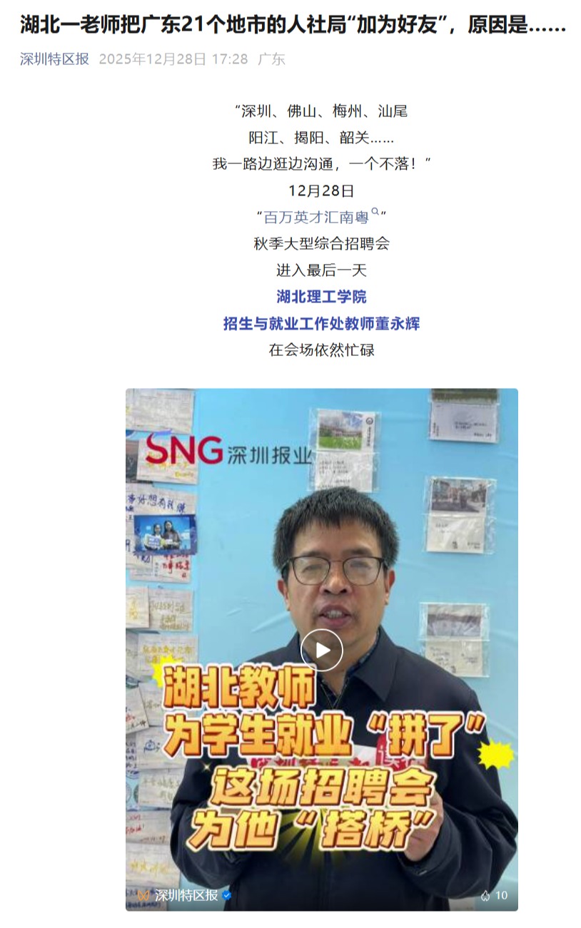 本网消息 近日,深圳特区报以“湖北一老师把广东21个地市的人社局加为好友,原因是”为题,报道我校为学生搭建立体化、精准化的就业对接平台。该报道已被腾讯网、荆楚网、潇湘晨报、读特新闻等多家媒体转载。