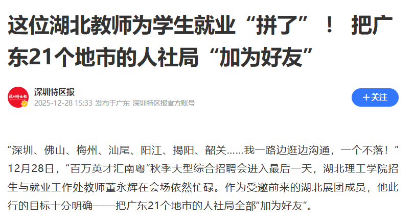 深圳特区报:这位湖北教师为学生就业“拼了” ! 把广东21个地市的人社局“加为好友”