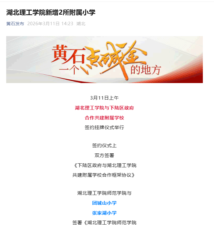 黄石发布:湖北理工学院新增2所附属小学